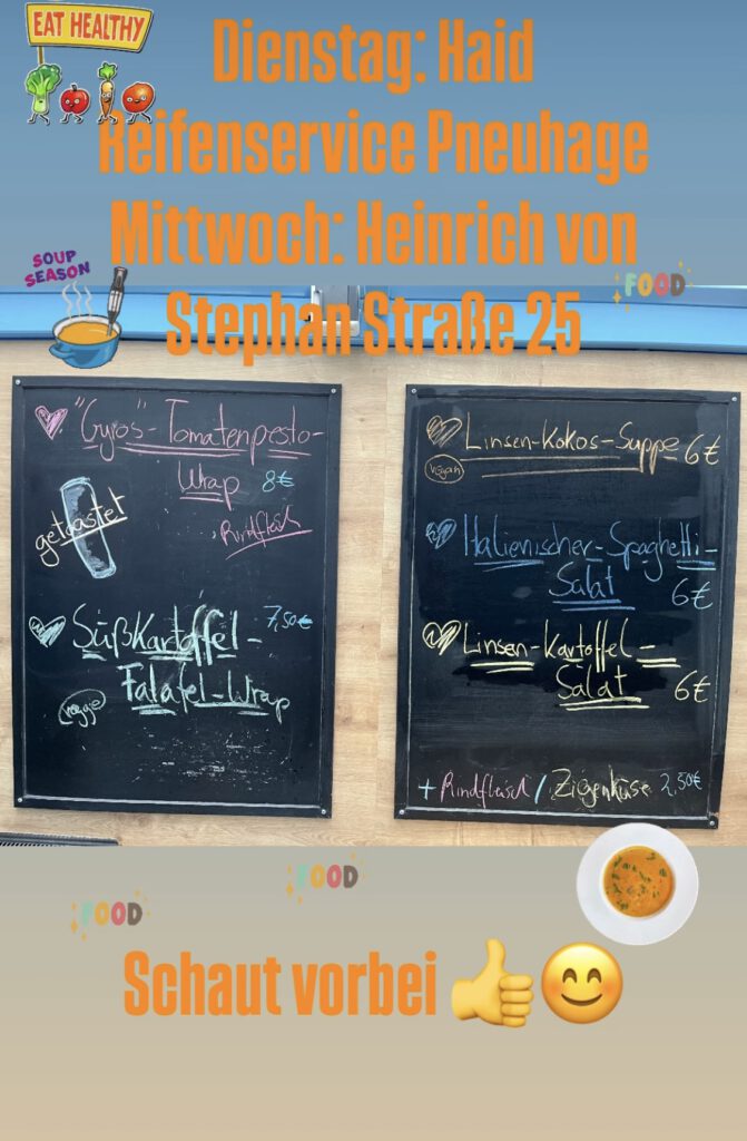 Hier findet Ihr uns Dienstags Freiburg Gewerbegebiet Haid Pneuhage Reifendienst Waltershofenerstraße 12 11:30 bis 13:30 Uhr Mittwochs Freiburg Heinrich-von-Stephan-Str. 25 bei InterChalet 11:30 bis 13:30 Uhr Donnerstags vorübergehend nicht