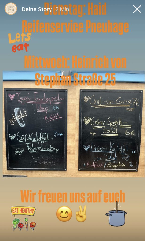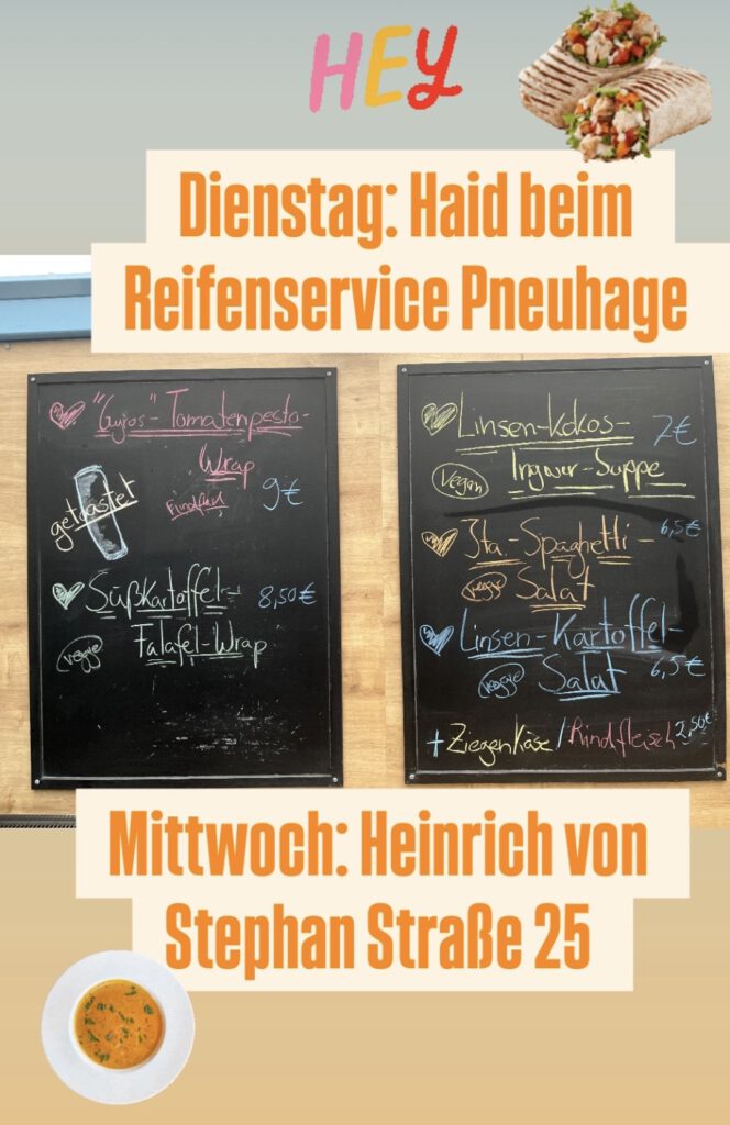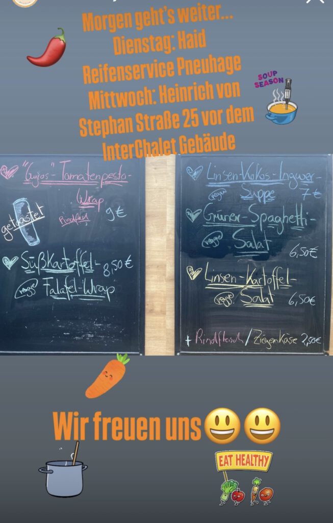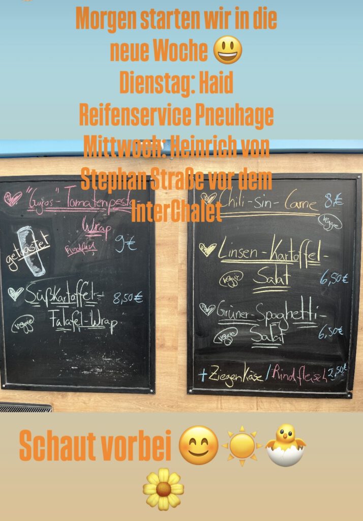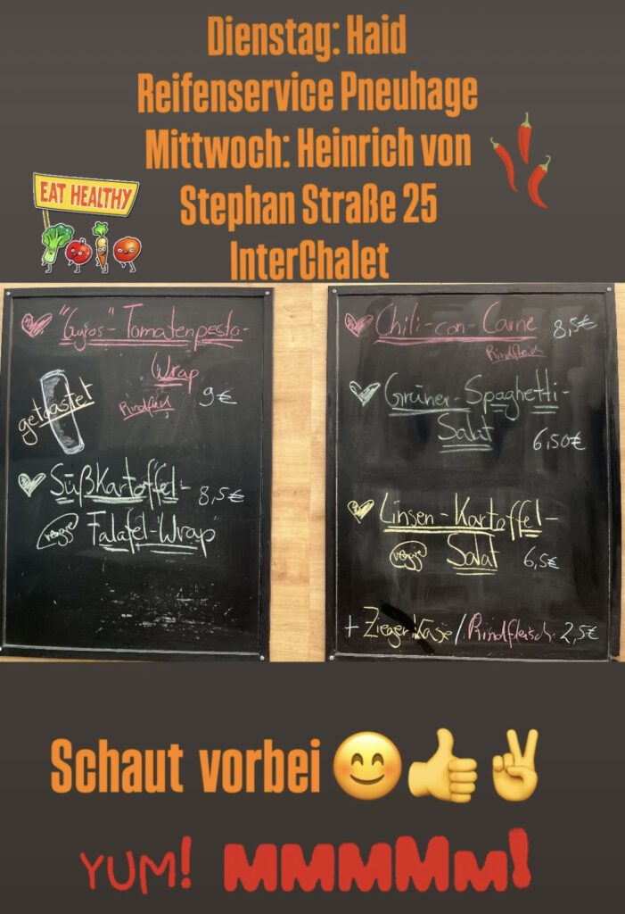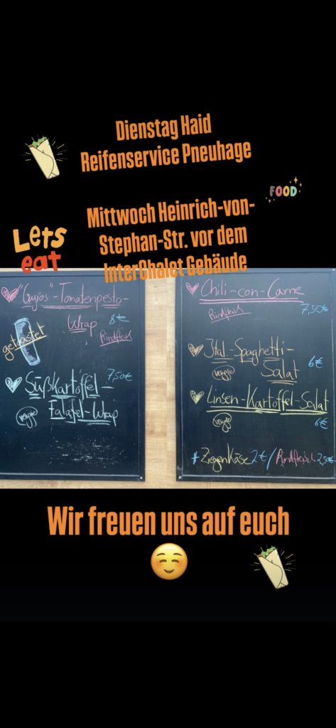 Hier findet Ihr uns Dienstags Freiburg Gewerbegebiet Haid Pneuhage Reifendienst Waltershofenerstraße 12 11:30 bis 13:30 Uhr Mittwochs Freiburg Heinrich-von-Stephan-Str. 25 bei InterChalet 11:30 bis 13:30 Uhr Donnerstags vorübergehend nicht