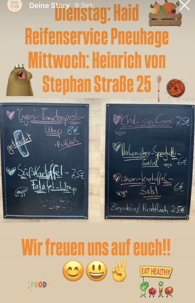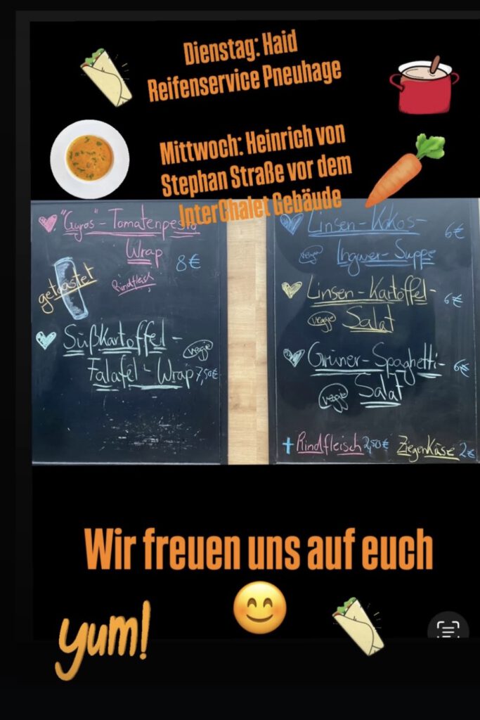 Das bieten wir an LIEBLINGSROLLE Süßkartoffel-Falafel-Wrap „Gyros“-Tomatenpesto-Wrap Mediterraner-Rindfleisch-Wrap SATTMACHER Chili-Con-Carne Italienischer-Erbseneintopf Spaghetti-Bolognese Orientalischer-Kichererbseneintopf Mediterraner-Gemüse-Hackfleischauflauf LIEBLINGSBURGER Ziegenkäse-Burger SUPPENLIEBE Rote-Linsen-Kokos-Suppe Badische-Kartoffelsuppe Zuccini-Erbsensuppe DA HABT IHR DEN SALAT Italienischer Spaghetti-Salat Couscous-Salat Linsen-Kartoffel-Salat Grüner-Spaghetti-Salat